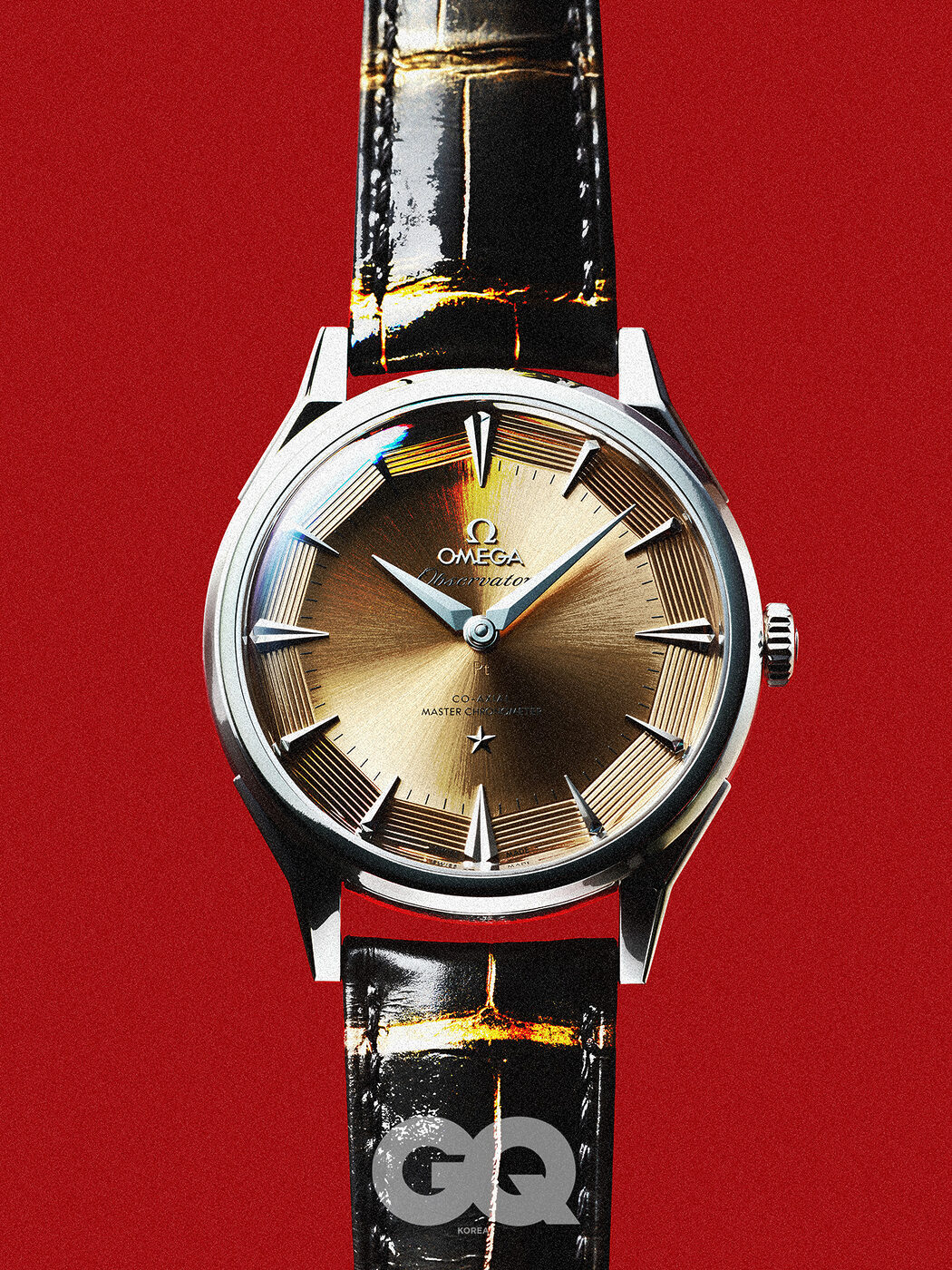 플래티넘 골드 케이스에 긁힘에 강한 돔형 사파어어 크리스털 글라스를 사용했다. 1950년대 오리지널 컨스텔레이션 모델에서 영감 받은 벽돌 패턴 스트랩 사이사이에 골드 컬러를 넣어 특별함을 더한 시계. 컨스텔레이션 옵저버토리 39.4MM 8천2백만원대, 오메가.