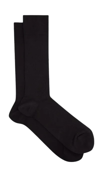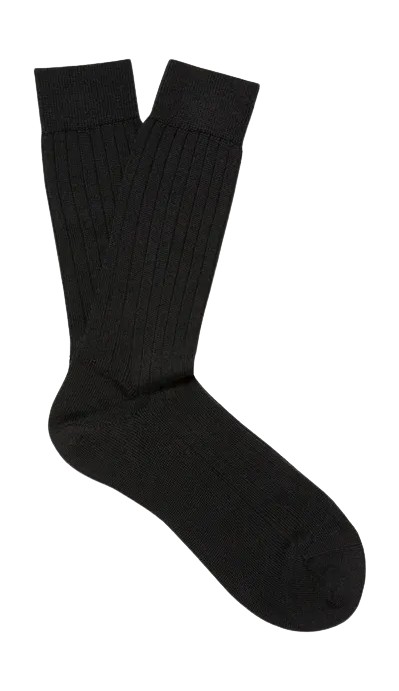 이제 스타일링이다. 수트나 슬랙스에는 정제된 느낌을 유지해야 한다. 얇은 니트의 종아리 길이 양말을 선택해 바지 아래에서 자연스럽게 숨도록 한다. 특히 슬림 핏 팬츠에서는 두꺼운 양말이 발목에 부피를 만들어 실루엣을 망칠 수 있다.