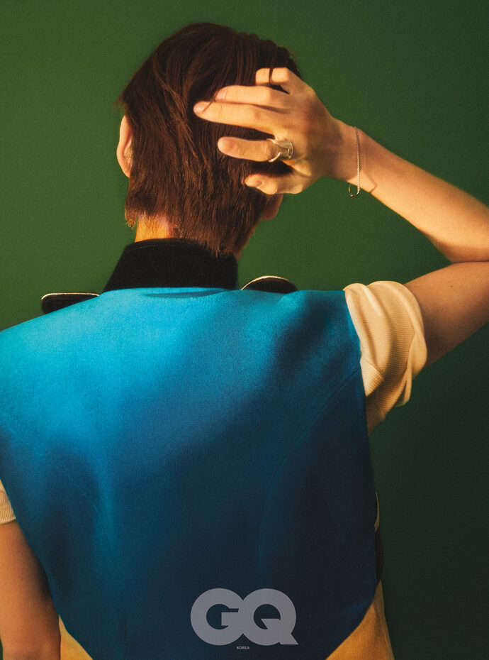베스트, 케부리아. 팬츠, 베인. 벨트, 셀린느. 슈즈, 어니스트.W.베이커. 톱은 스타일리스트의 것.