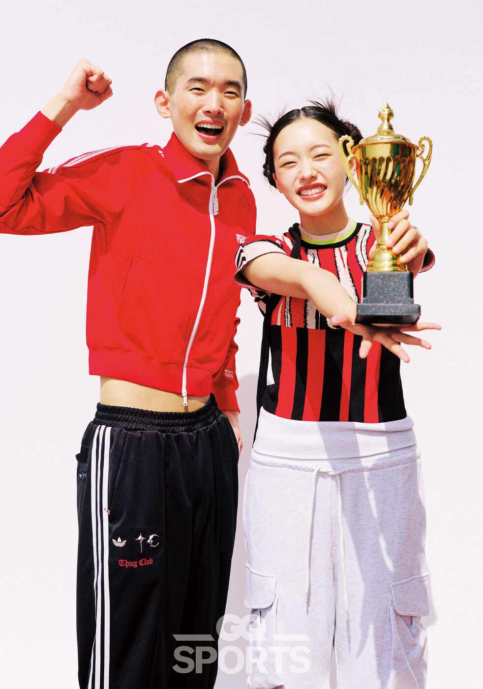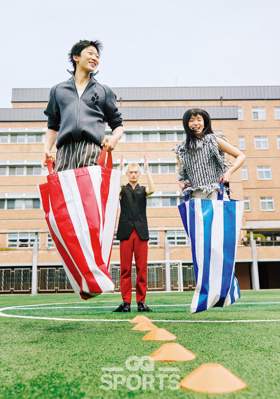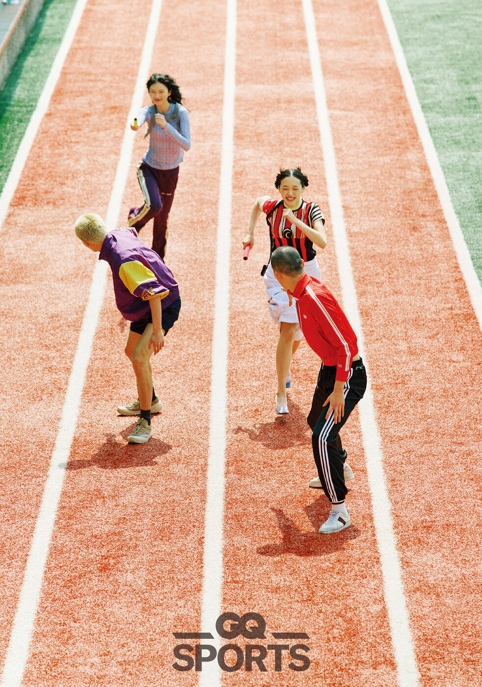 레드 트랙 톱, 오니츠카 타이거. 블랙 조거 팬츠, 아디다스 오리지널스 × 떠그클럽. 레드 자카드 니트 톱, 오토링거 at 아데쿠베. 그레이 조거 쇼츠, 오픈 YY.