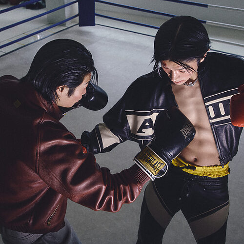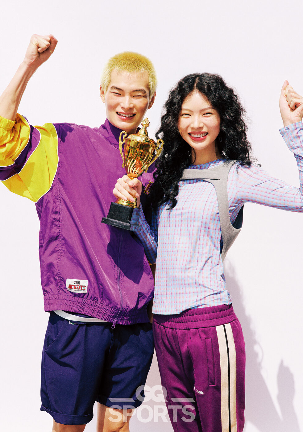 체크 프린트 톱, 후포. 그레이 하네스, 마이너스플러스웨어. 퍼플 트랙 팬츠, 팜 엔젤스. 컬러 블록 웜업 재킷, NBA. 네이비 나일론 팬츠, 몽클레르. 베이지 스니커즈, 몽클레르. 레드 자카드 니트 톱, 오토링거 at 아데쿠베. 그레이 조거 쇼츠, 오픈 YY. 샌들, 보테가 베네타. 레드 트랙 톱, 오니츠카 타이거. 블랙 조거 팬츠, 아디다스 오리지널스 × 떠그클럽. 화이트 웹 스니커즈, 구찌.