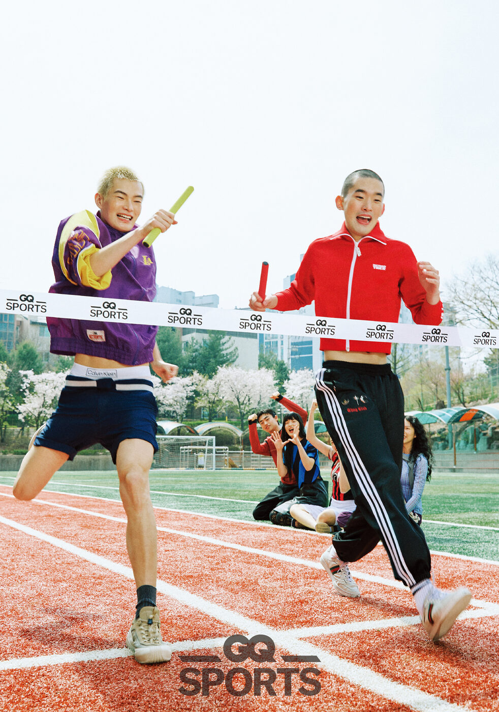 컬러 블록 웜업 재킷, NBA. 네이비 나일론 팬츠, 몽클레르. 화이트 브리프, 캘빈클라인. 베이지 스니커즈, 몽클레르. 레드 트랙 톱, 오니츠카 타이거. 블랙 조거 팬츠, 아디다스 오리지널스 × 떠그클럽. 화이트 웹 스니커즈, 구찌.