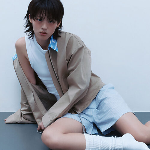 레더 코트, 보테가 베네타. 화이트 턱시도 셔츠, 블랙 바이커 쇼츠, 블랙 삭스, 모두 드리스 반 노튼. 블랙 보타이, 코스. 블랙 도트 슈즈, 캠퍼.