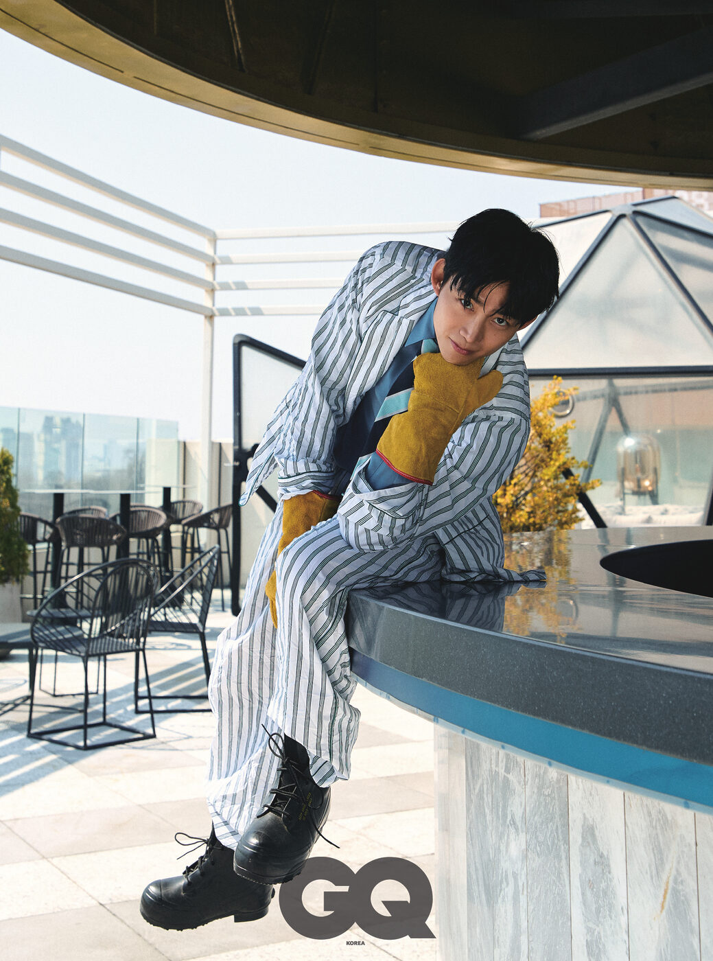 블루 셔츠 스트라이프 셋업, 모두 돌체앤가바나. 타이, 글러브, 블랙 슈즈는 모두 스타일리스트의 것.