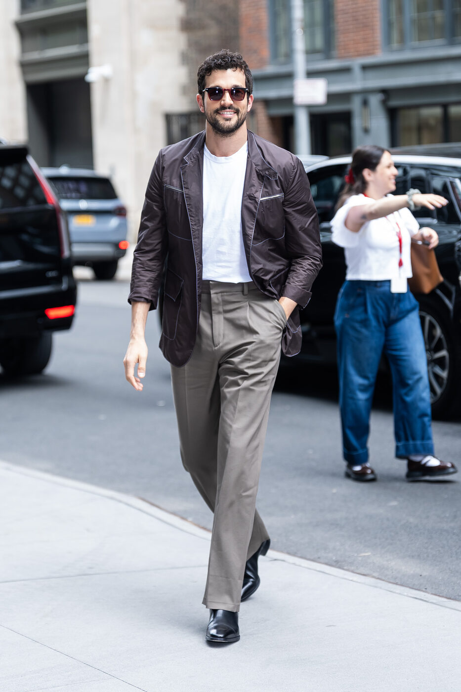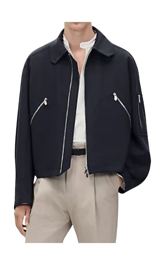 러브 스토리 배우의 재킷 투어는 뉴욕의 에이비시 스튜디오에서 시작됐다. 그는 에르메스 2026 봄·여름 런웨이에서 막 나온 듯한 브라운 블레이저를 입고 등장했다. 말만 들으면 월스트리트 은행원 느낌이 날 법하지만, 실제로는 훨씬 여유롭다. 스냅 버튼, 나일론 소재, 여분의 포켓 덕분이다.