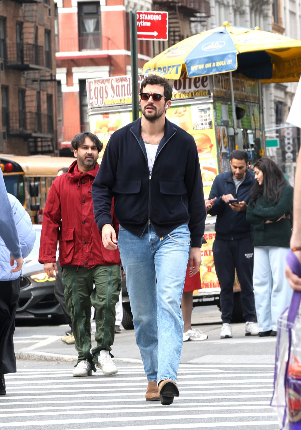 그의 남성복 투어 다음 행선지에서 켈리는 폴 앤 샤크의 캐시미어 보머를 입고 이동 중이었다. 블루 진과 A급 선글라스를 단번에 업그레이드하는 쉬운 선택이다. 더블 지퍼를 활용해 실루엣을 만들고, 안에는 흰색 베스트를 입어 가슴털이 살짝 보이게 했다. 벨트 체인도 잊지 않았다.